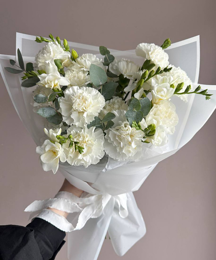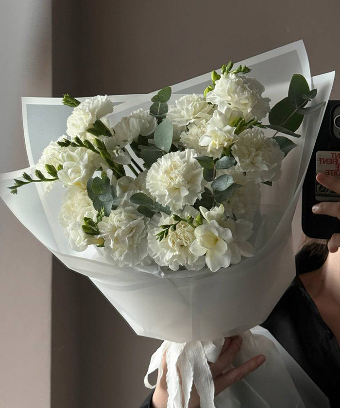 Букет «Белый Шелк» — гармоничное сочетание белых диантусов, эвкалипта и фрезии, создающее атмосферу нежности и утончённости. Идеально подходит для поздравления с днём рождения, поздравления молодожёнов или просто как знак внимания. Закажите букет с диантусами и фрезией с быстрой доставкой по Иркутску от Fashion Flowers.