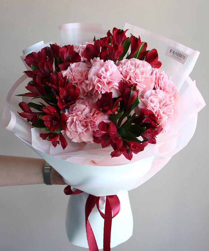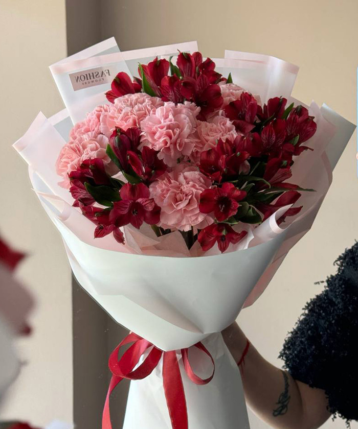 Букет «Марокко» — это насыщенная композиция, вдохновлённая восточной палитрой и атмосферой праздника. Красные альстромерии и диантусы сочетаются с теплыми акцентами, создавая образ энергии, страсти и роскоши.