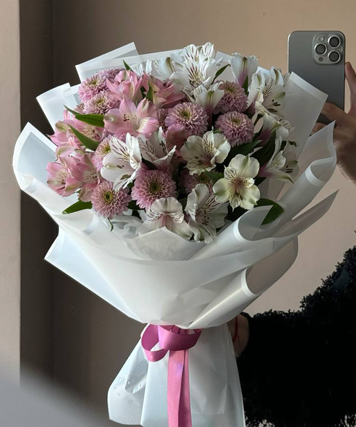 Букет «Нежный румянец» — это лёгкий и гармоничный букет, созданный из свежих цветов в мягких розово-кремовых оттенках. Лепестки розовой и белой альстромерии перфекшн нежны как весенний ветер, а помпонные розовые бутоны хризантемы Летсгоу пинк очаровывают переливом оттенка. Он словно передаёт лёгкое тепло, смущённую улыбку и чувственность момента.
