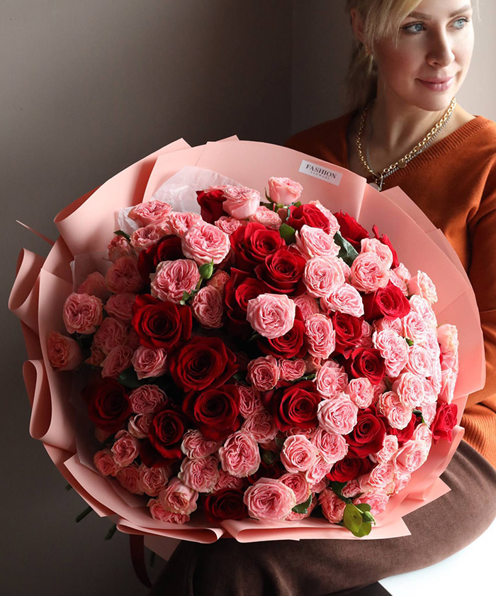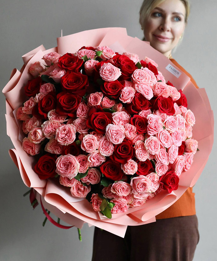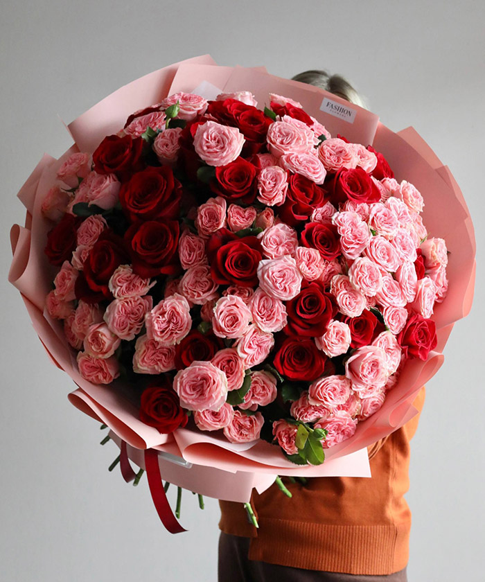 "Очарование" роскошный букет из красных роз Эксплорер и розовых кустовых роз №5785
