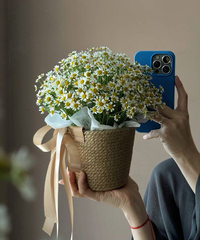 Ромашки танцетум в джутовой корзинке — это трогательная и свежая композиция, символизирующая искренность и лёгкость. Натуральная джутовая корзинка придаёт подарку особое очарование и делает его стильным элементом интерьера.
