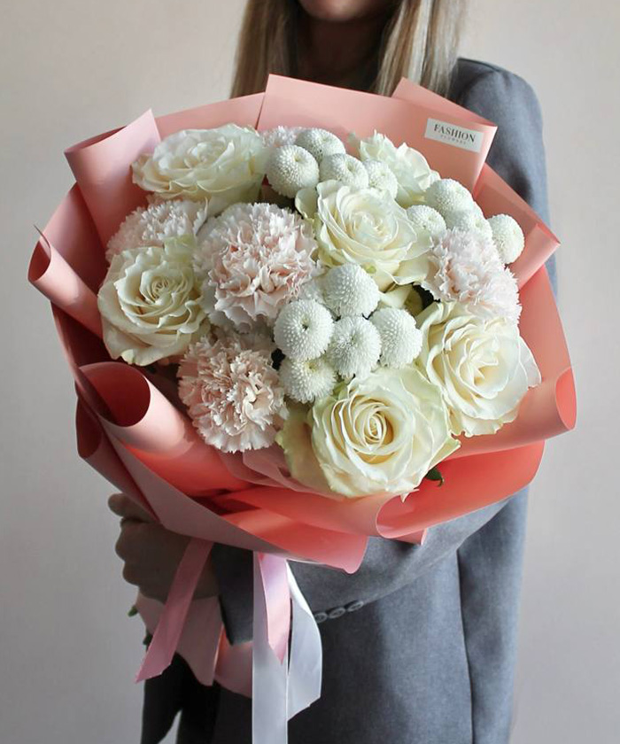 Букет «Тепло рассвета» — это гармоничный букет в мягких светлых оттенках, где белые розы Мондиаль сочетаются с помпонной белой хризантемой ньютон и молочными диантусами. Нежный аромат и лёгкие тона создают ощущение утреннего тепла, чистоты и спокойствия.