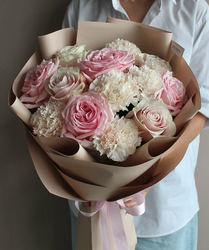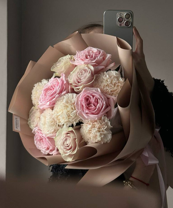 Букет «Вдохновение» — это светлая и утончённая композиция, в которой классические розы сочетаются с изящными диантусами. Мягкие оттенки и гармоничное оформление создают ощущение лёгкости и радости.