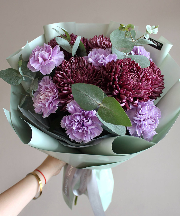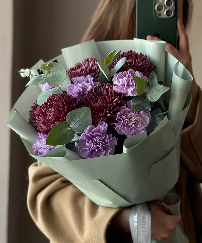 Букет «Вечерний Прованс» — это авторский букет-комплимент с хризантемой бигуди и изысканными лунными диантусами Мун Аква. Нежная цветовая гамма и стильное оформление передают атмосферу южного вечера и создают ощущение уюта и гармонии.